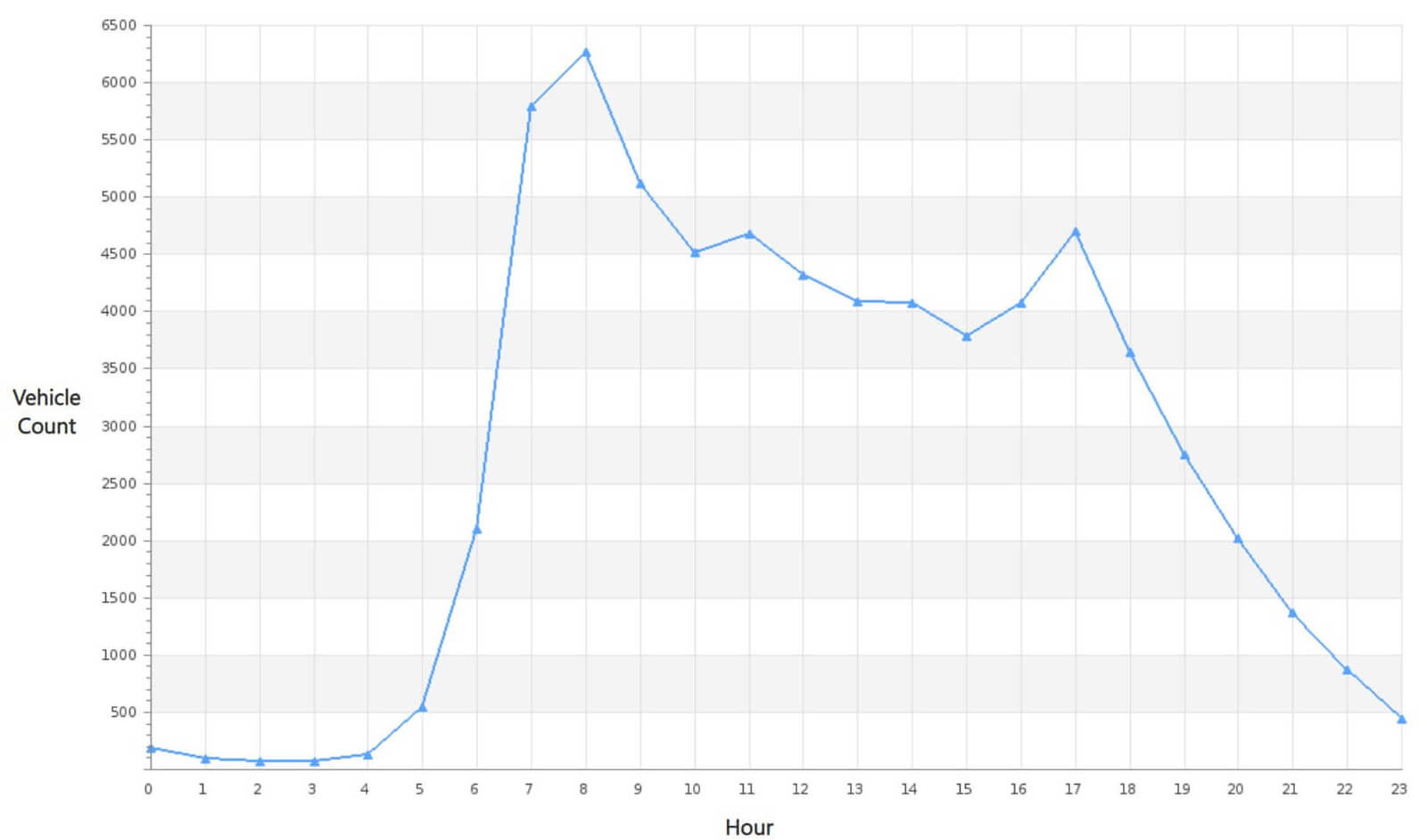 And, the following graph shows the volume of traffic going down Lakewood broken down by the time of day. Not surprisingly, our traffic volume is greatest in the mornings, spiking between 7am and 9am.