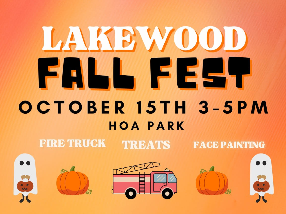 Join us for a fall festival at the Lakewood HOA Park on Lakewood Drive, near the pool and clubhouse from 3 to 5 p.m. Saturday, Oct. 15. Yummy treats and drinks will be provided.