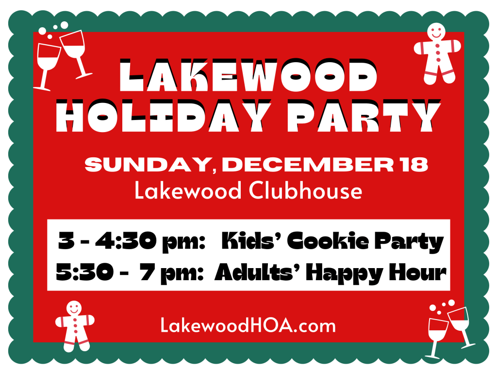 The holidays are here! Let’s get together for the Lakewood HOA’s holiday party at the HOA Clubhouse on Sunday, Dec. 18!