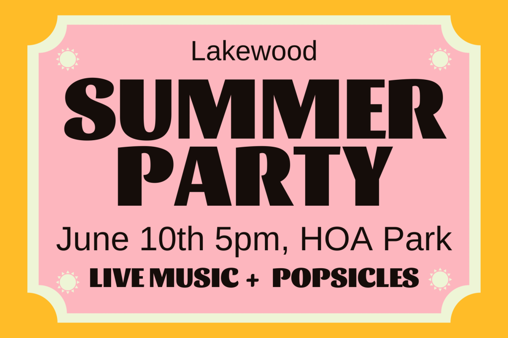 Lakewood summer party is Saturday, June 10! Posted on May 19, 2023 by lakewoodeditor2 Please join us for the Lakewood Summer Party at 5 p.m. Saturday, June 10 at the HOA park! Live music and popsicles will be provided. BYOB. Feel free to bring a picnic set-up. See you there! Share this: Click to share on X (Opens in new window) X Click to share on Facebook (Opens in new window) Facebook Like Loading... Related